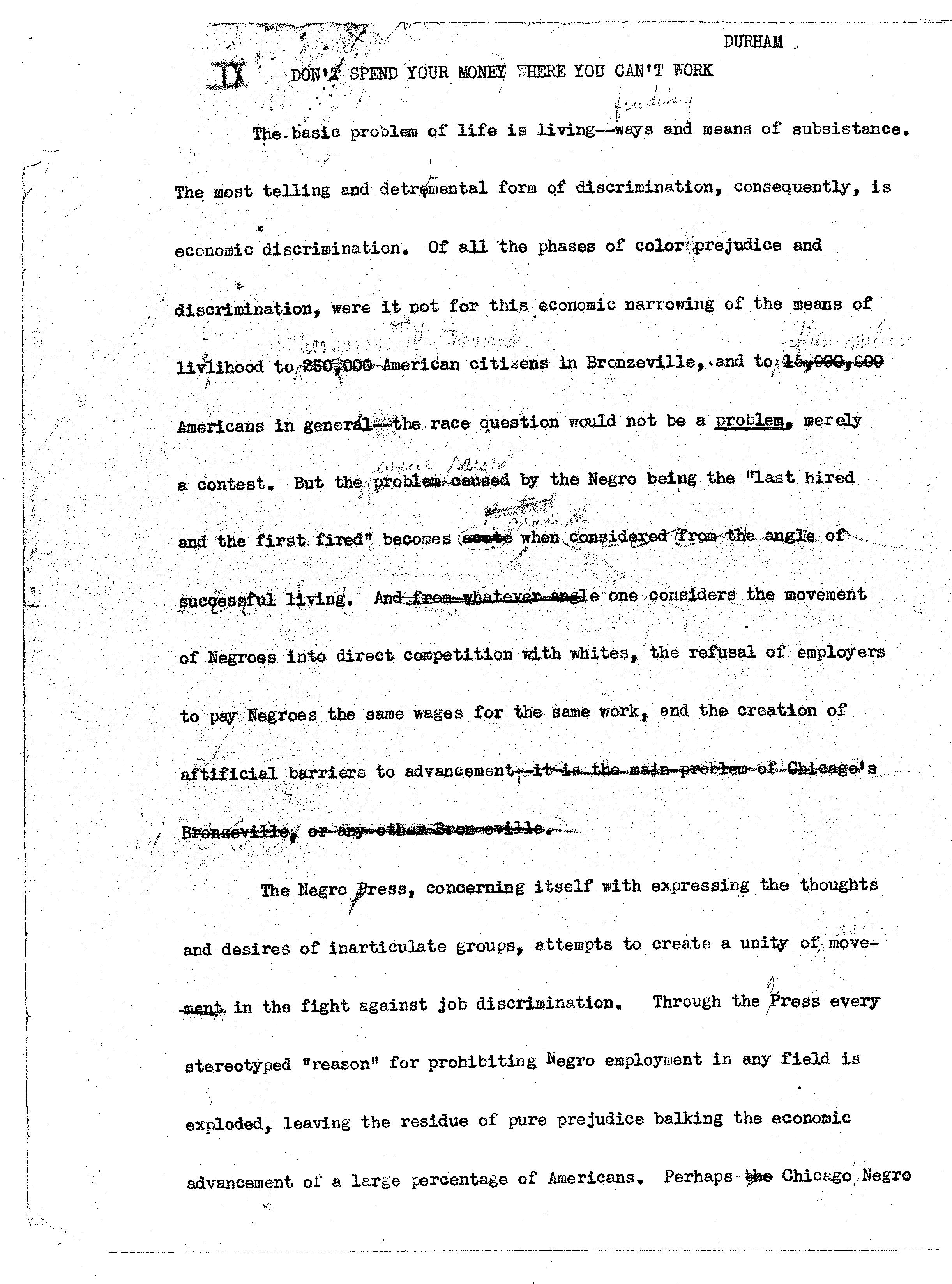 Before making his mark in radio, Durham got his start on the Illinois Writers’ Project. He first worked on a study of the black press headed by Horace Cayton, author of the landmark sociology Black Metropolis. In early 1939, Durham joined the WPA and recorded surveys of black newspapers. According to an outline, “Don’t Spend Your Money Where You Can’t Work” was one of ten chapters for an unpublished book on the black press. While the essay is not dated, it was probably written in the late spring of 1939. Soon after, Durham was transferred to the Illinois Radio Project, where he met Oscar Brown, Jr. and Studs Terkel, and it was here that he discovered his love for radio.