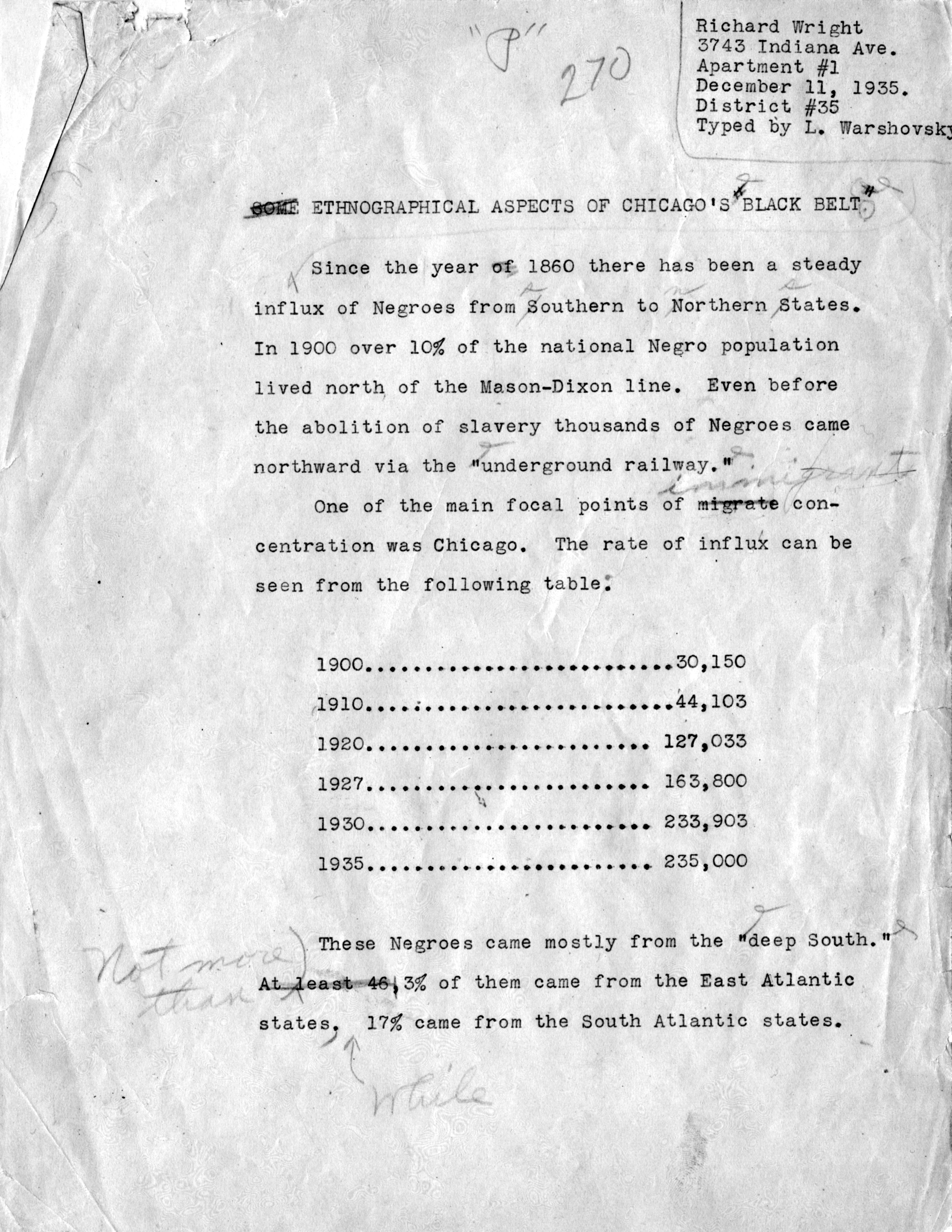 Wright was most likely the first African American writer to work on the WPA in Illinois. The essay “Ethnographical Aspects of Chicago’s Black Belt” is dated December 11, 1935.